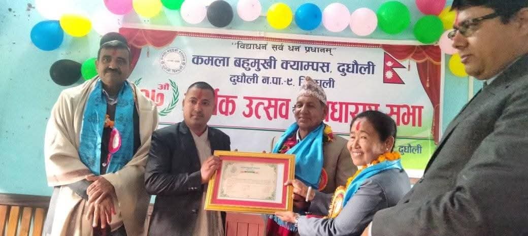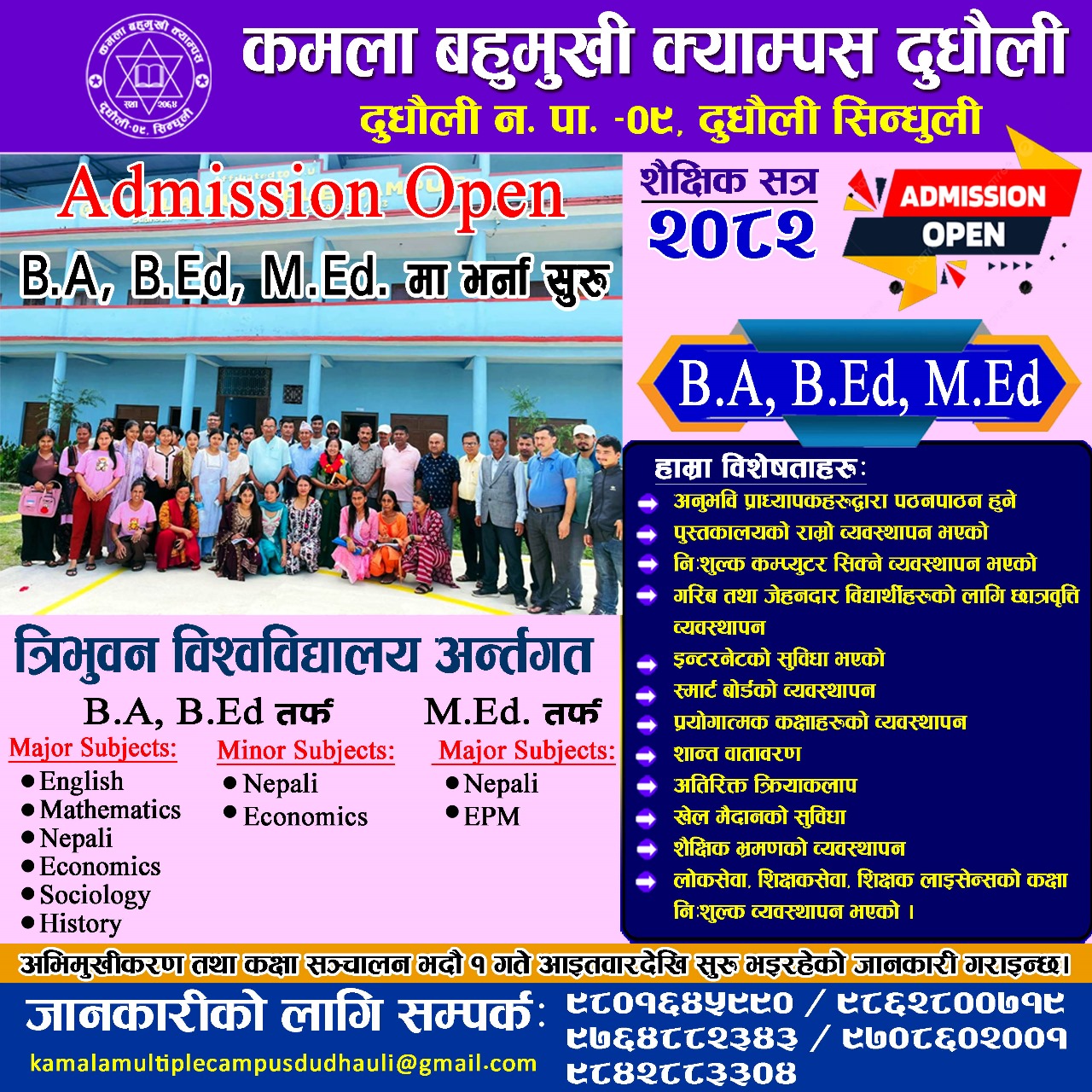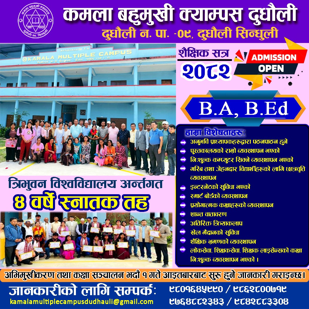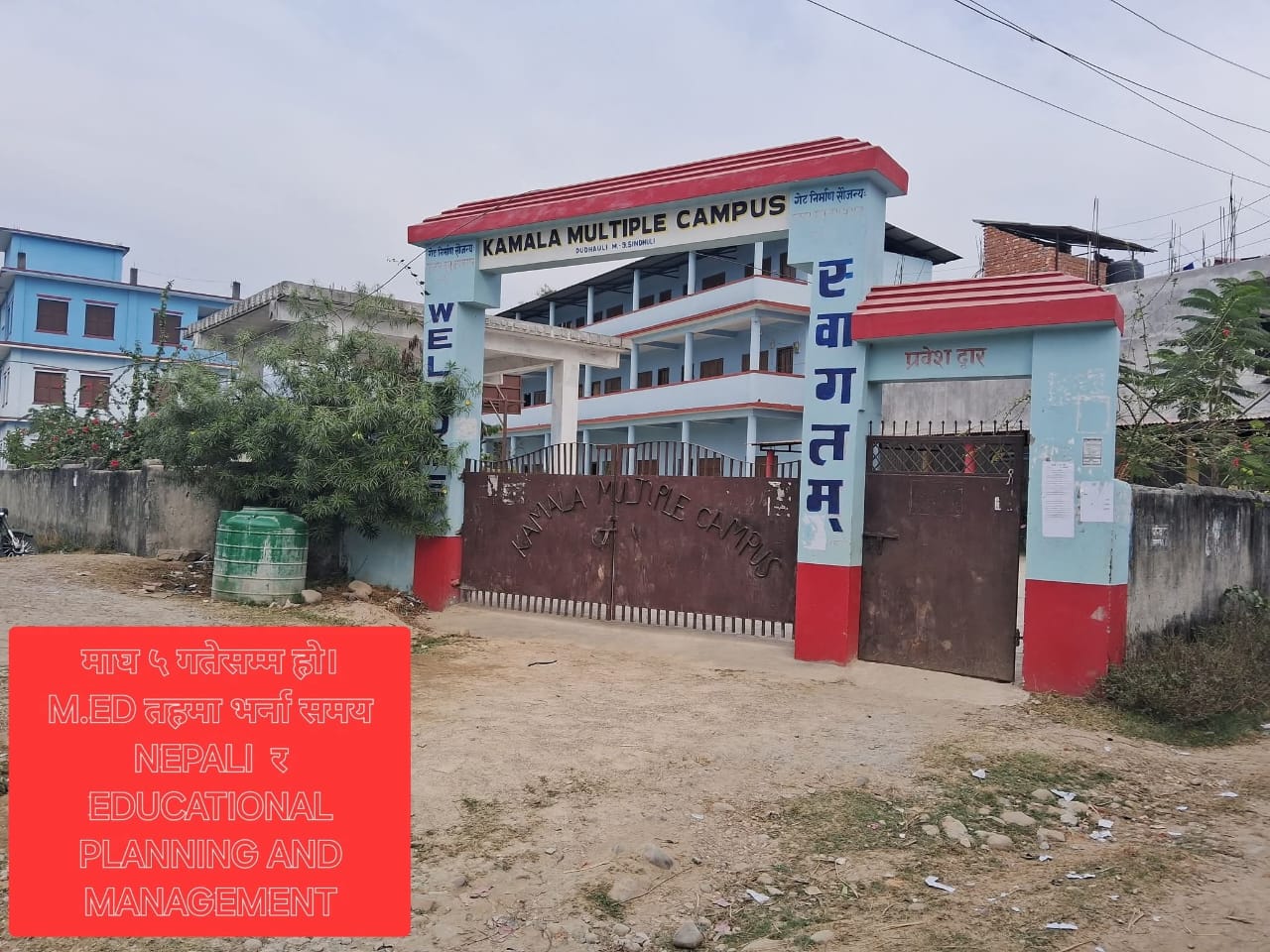 Kamala Multiple Campus was established in 2008 (2064 BS) as a community based campus. It is located in Dudhauli, Sindhuli district of Nepal. It is affiliated to Tribhuvan University and recognized from University Grant Commission of Nepal. It offers full time bachelor degree programs in Bachelor of Education (B.Ed.) and Bachelor of Arts (BA).